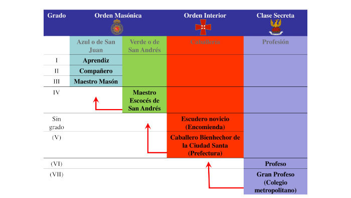 Por sobre la Orden interior existía en el siglo XVIII la Clase secreta o Profesión, reunida en Colegio metropolitano, y conformada por dos